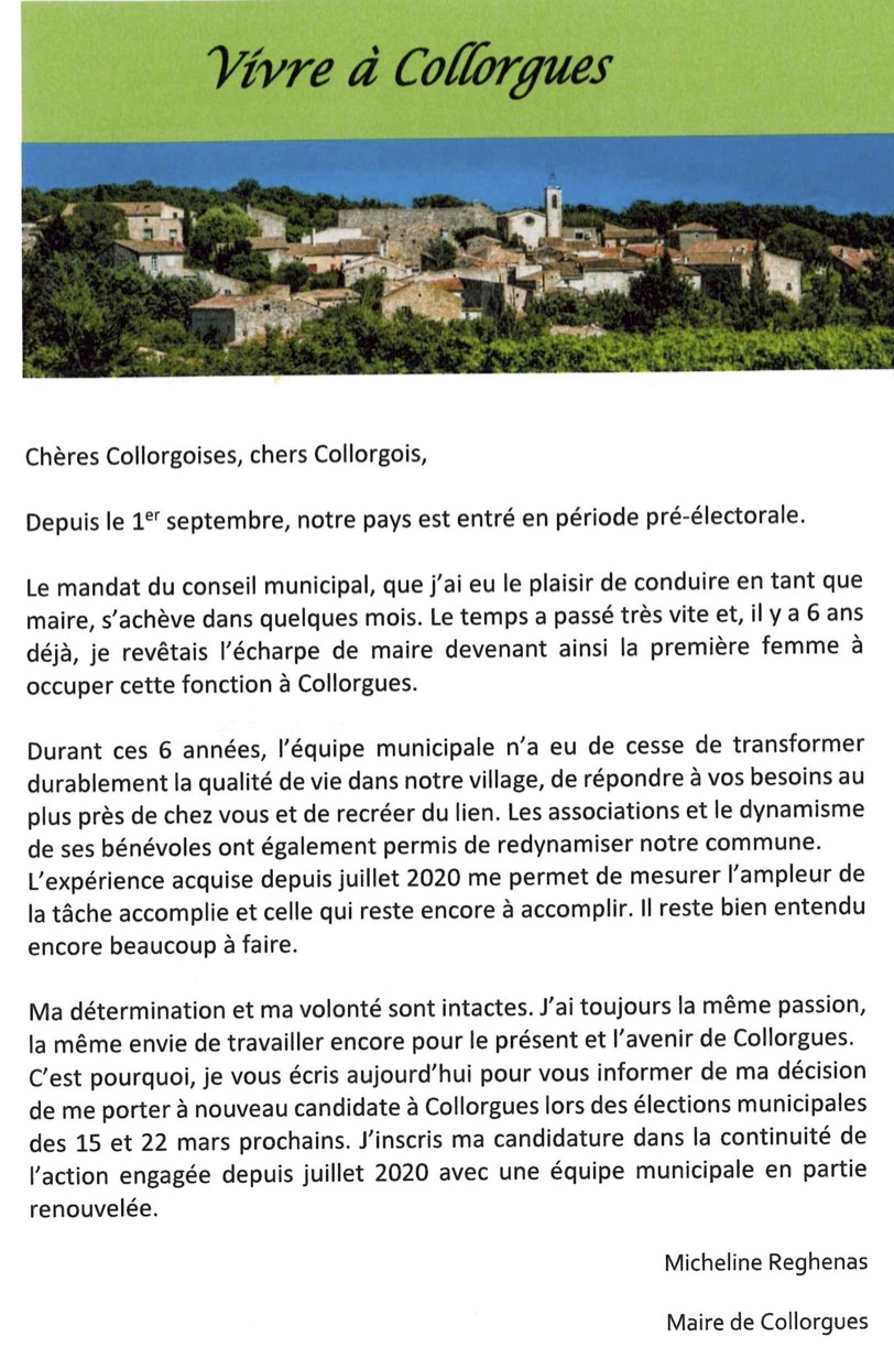Rappelons enfin que, début septembre, dans la continuité de l'action menée depuis 2020, Micheline Reghenas a annoncé son intention de solliciter un nouveau mandat avec une équipe en partie renouvelée (cf. bulletin municipal n°15 et, dans la rubrique "On parle de nous", les articles du Midi Libre et du Républicain d'Uzès et du Gard)