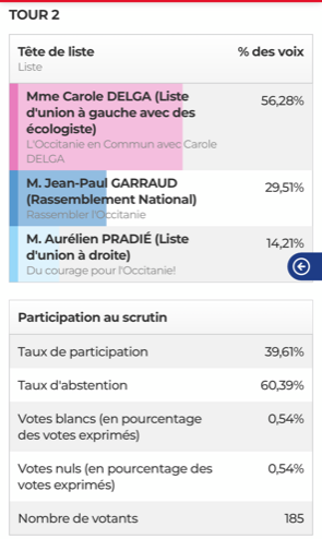 Au second tour des régionales, la présidente de la région Occitanie a remporté l'élection, avec 103 voix contre 54 à Jean-Paul Garraud, soit 56, 28 % contre 29,51 % des suffrages exprimés. La troisième liste menée par Aurélien Pradié (LR) a totalisé quant à elle 14,21 % des suffrages (26 voix).