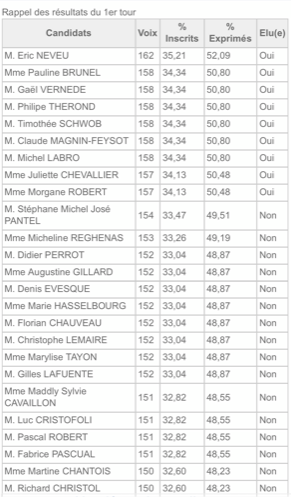 Sont élus: Eric Neveu; Pauline Brunel; Gaël Vernède; Philippe Thérond; Timothée Schwob; Claude Magnin-Feysot; Michel Labro; Juliette Chevallier; Morgane Robert