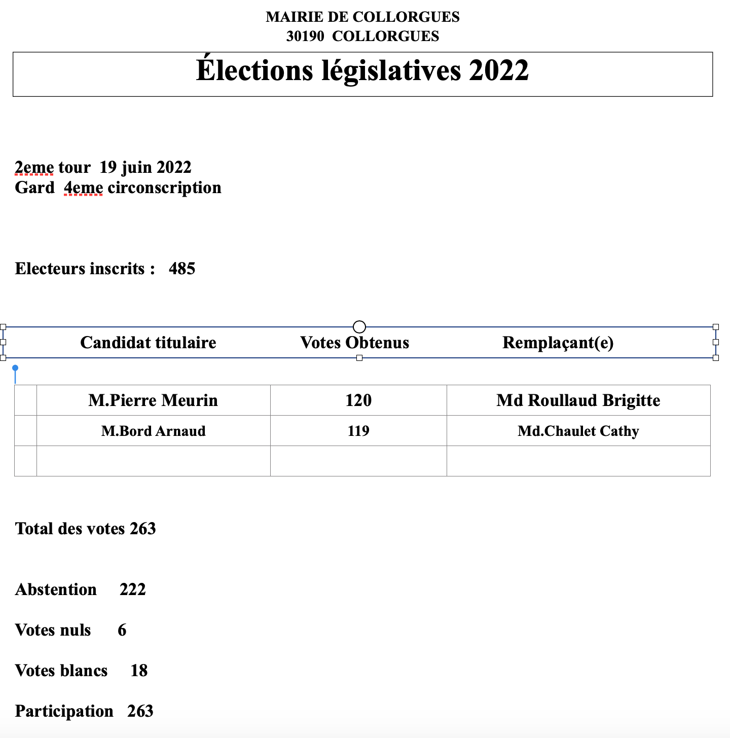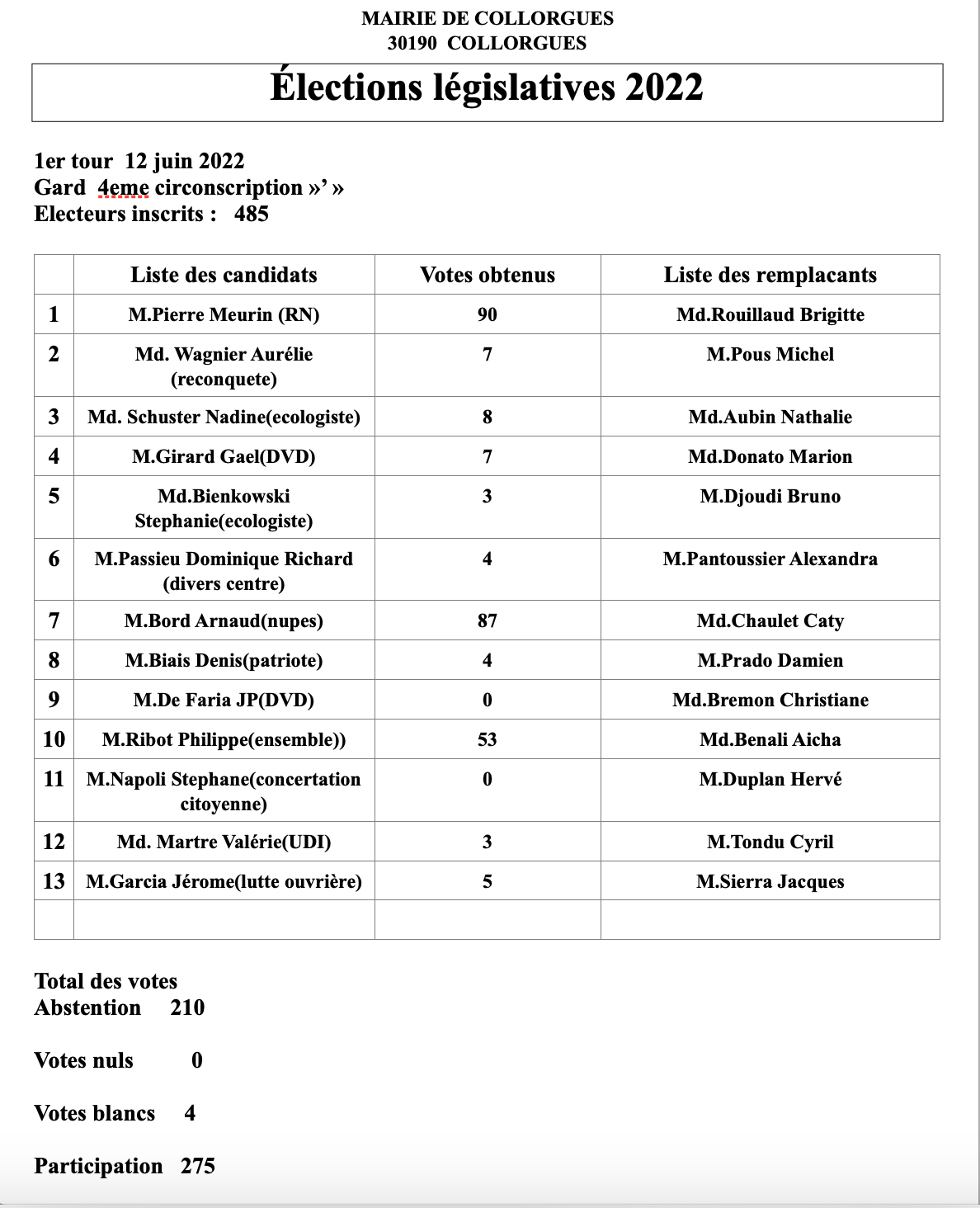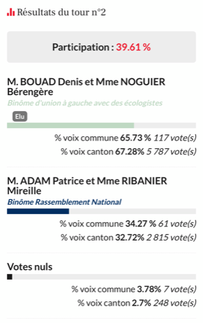 C'est d'une courte voix que le candidat du Rassemblement National, Monsieur Pierre MEURIN (120 votes, 50,21 % des suffrages) devance, le dimanche 19 juin, à Collorgues, Monsieur Arnaud BORD, premier secrétaire fédéral du PS et candidat de la Nouvelle union populaire écologique et sociale, qui obtient 49,79 % des suffrages, avec 119 votes.