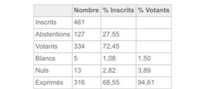 Inscrits 509, Votants 366, Abstentions 143, Blancs 4, Nul 1