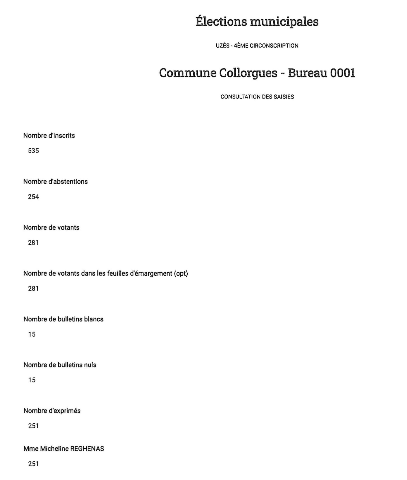 Rappelons enfin que, à Collorgues (467 électeurs inscrits, 185 votants), le taux de participation au second tour des élections a atteint 39,61 %, soit un taux légèrement supérieur à la moyenne nationale qui est de 34,3 %.